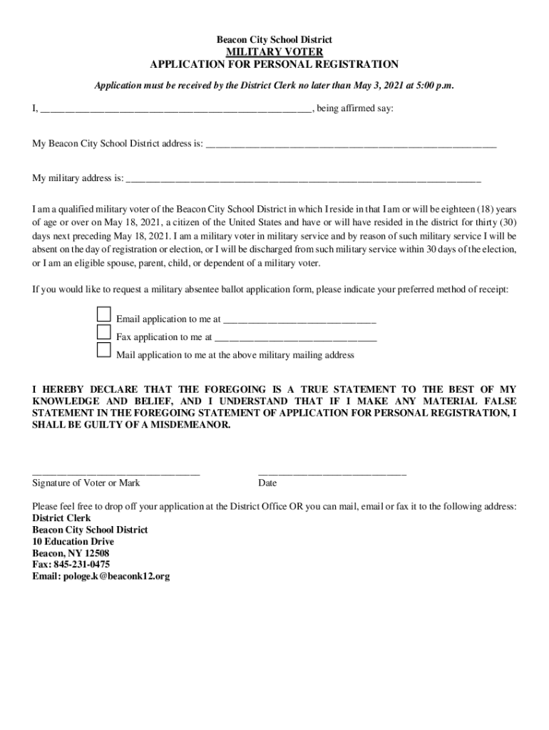 Beacon City School DistrictMILITARY VOTER APPLICATION FOR PERSONAL REGISTRATION Application must be received by the District Clerk no later than May 3, 2021, at 5:00 p.m. I, ___, being affirmed say:My