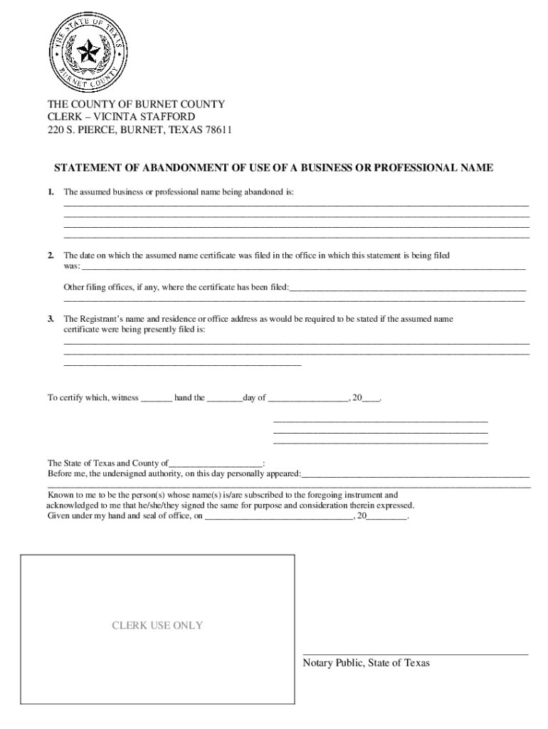 THE COUNTY OF BURNED COUNTY CLERK VICINITY STAFFORD 220 S. PIERCE, BURNED, TEXAS 78611STATEMENT OF ABANDONMENT OF USE OF A BUSINESS OR PROFESSIONAL NAME 1. The assumed business or professional name