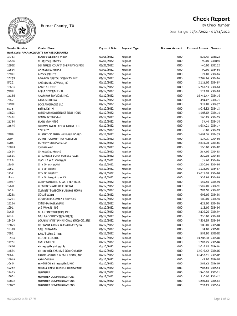 Check Report By Check NumberBurnet County, Date Range: 07/01/2022 07/31/2022Vendor Number Vendor Name Bank Code: APCAACCOUNTS PAYABLE CLEARING 14733 BLAIR\'S WESTERN WEAR 12594 CHARLES R. MYERS 15902