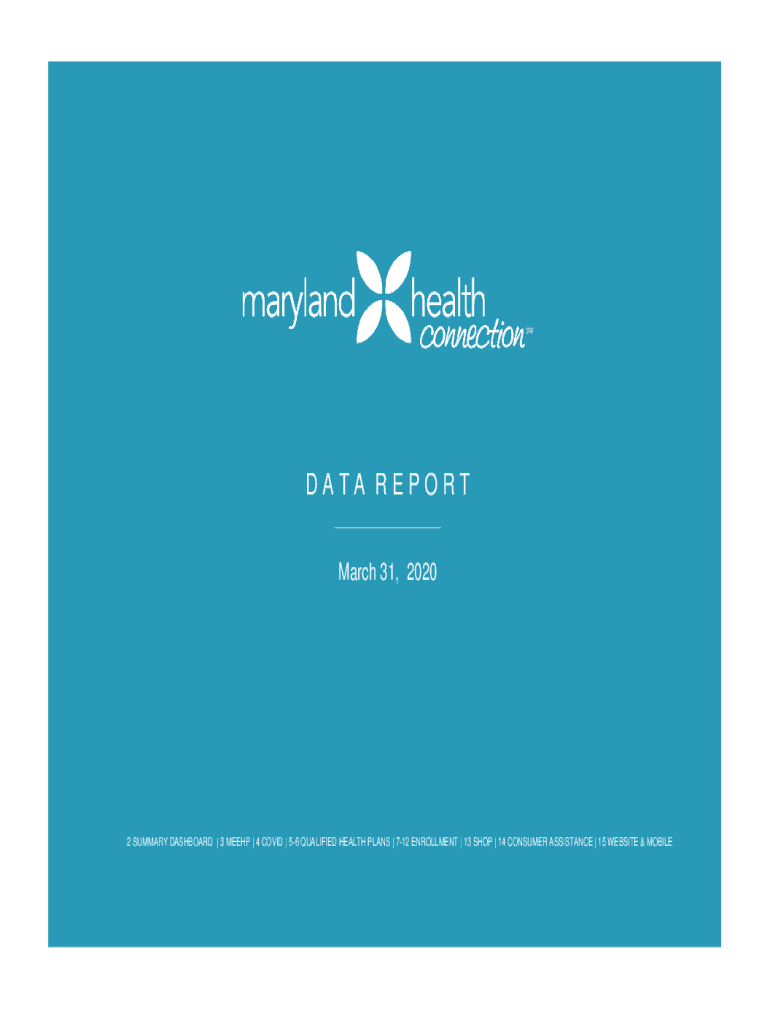 DATA REPORT March 31, 20202 SUMMARY DASHBOARD | 3 MEET | 4 COVID-19 | 56 QUALIFIED HEALTH PLANS | 712 ENROLLMENT | 13 SHOP | 14 CONSUMER ASSISTANCE | 15 WEBSITE & MOBILE|SUMMARY DASHBOARD HPS are