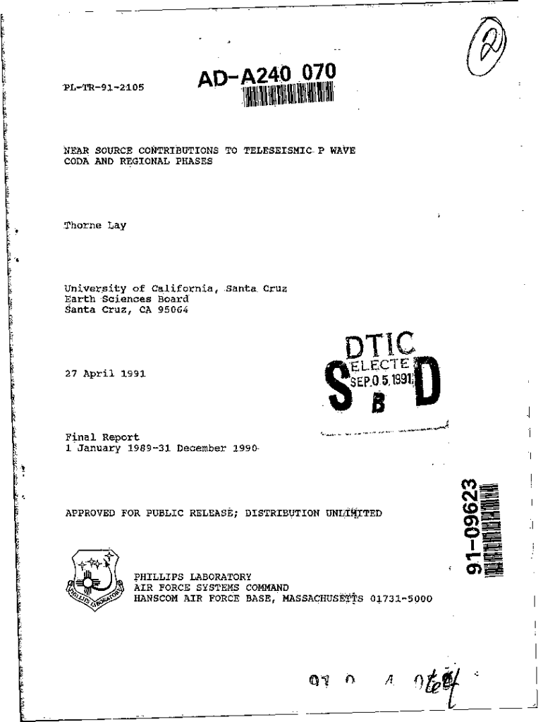 ADA24070NEAR SOURCE CONTRIBUTIONS TO TELESEISMIC P WAVE CODA AND REGIONAL PHASESThorne University of California, Santa Cruz Earth Sciences Board Santa Cruz, CA 9506427 April 1991EL\” ESTEEM 5.1991f
