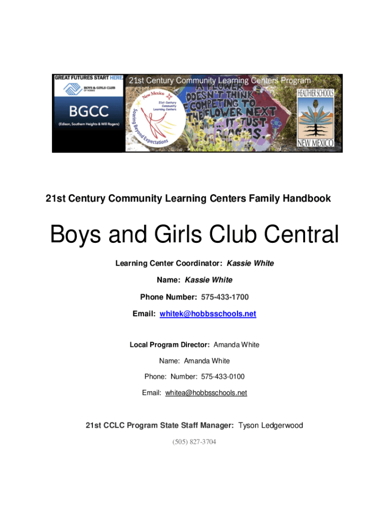 21st Century Community Learning Centers Family Handbooks and Girls Club Central Learning Center Coordinator: Cassie White Name: Cassie White Phone Number: 5754331700 Email: whitek@hobbsschools.netLocal