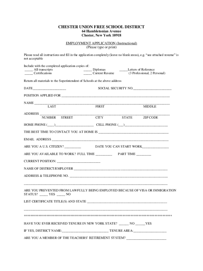 CHESTER UNION FREE SCHOOL DISTRICT 64 Hamiltonian Avenue Chester, New York 10918 EMPLOYMENT APPLICATION (Instructional) (Please type or print) Please read all instructions and fill in the application