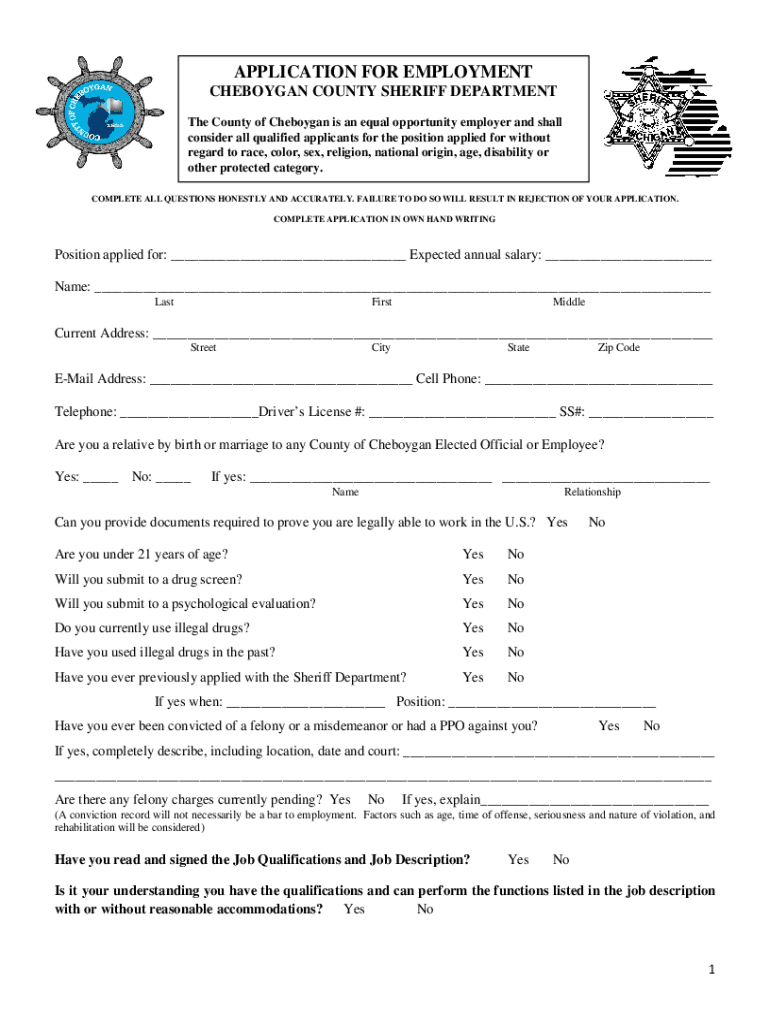 APPLICATION FOR EMPLOYMENT SHEBOYGAN COUNTY SHERIFF DEPARTMENT The County of Sheboygan is an equal opportunity employer and shall consider all qualified applicants for the position applied for without