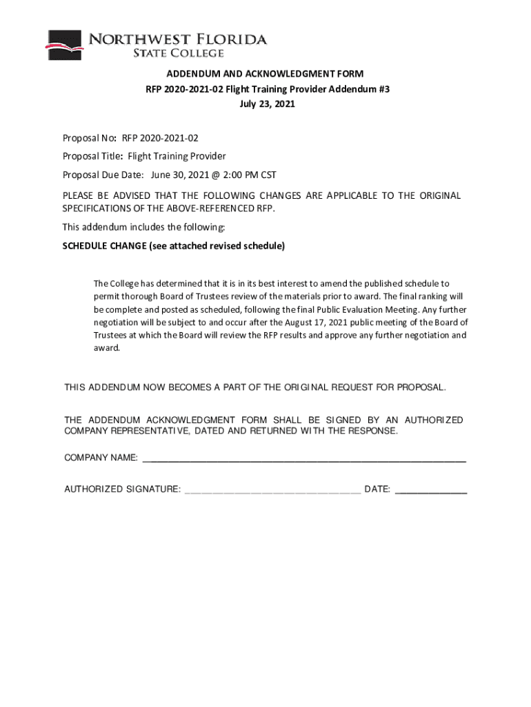 ADDENDUM AND ACKNOWLEDGMENT FORM RFP 2020202102 Flight Training Provider Addendum #3 July 23, 2021, Proposal No: RFP 2020202102 Proposal Title: Flight Training Provider Proposal Due Date: June 30,