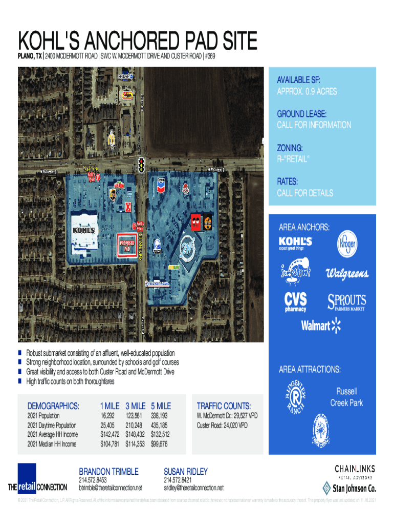 KOHL\'S ANCHORED PAD SITE PLANO, TX | 2400 McDermott ROAD | SIC W. McDermott DRIVE AND CUSTER ROAD | #369AVAILABLE SF: APPROX. 0.9 ACRES GROUND LEASE: CALL FOR INFORMATION ZONING: R\” RETAIL\”