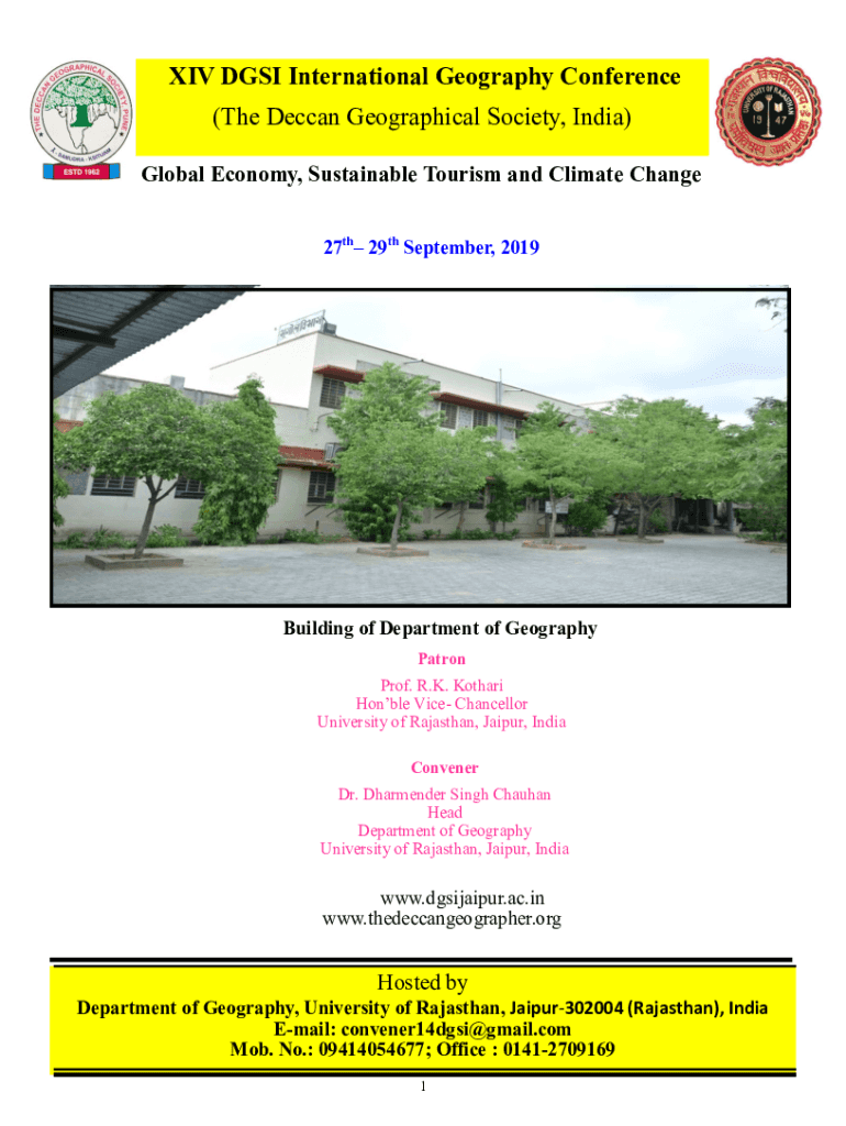 XIV DGSI International Geography Conference (The Deccan Geographical Society, India) Global Economy, Sustainable Tourism and Climate Change 27th 29th September, 2019Building of Department of Geography