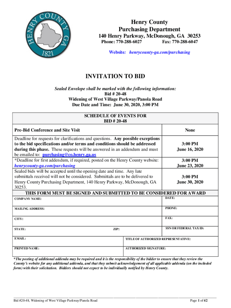 Henry County Purchasing Department 140 Henry Parkway, McDonough, GA 30253 Phone: 7702886027Fax: 7702886047Website: henrycountyga.com/purchasingINVITATION TO BID Sealed Envelope shall be marked with