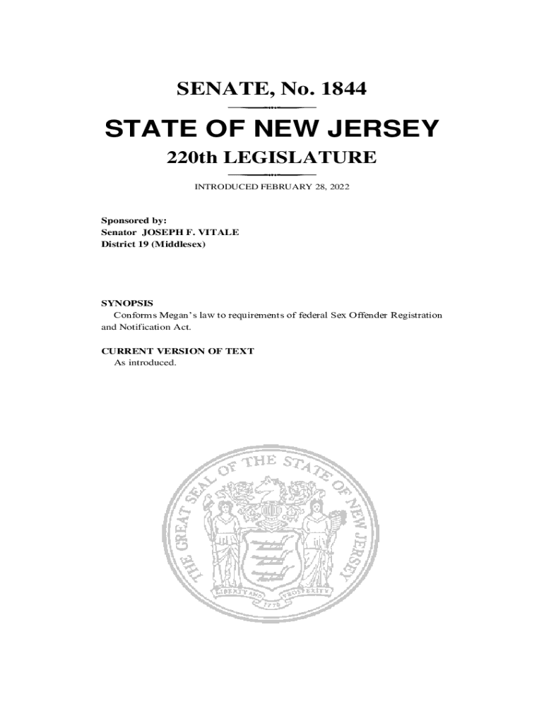 SENATE, No. 1844STATE OF NEW JERSEY 220th LEGISLATURE INTRODUCED FEBRUARY 28, 2022Sponsored by: Senator JOSEPH F. VITAL District 19 (Middlesex)SYNOPSIS Conforms Megan's law to requirements of federal