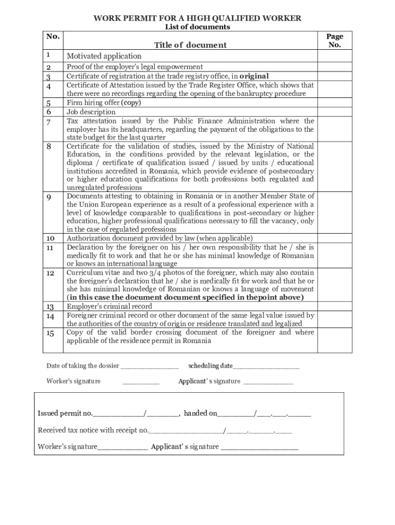 WORK PERMIT FOR A HIGH QUALIFIED WORKER List of documentsN0. Title of document1Motivated application2 3 4Proof of the employer\'s legal empowerment Certificate of registration at the trade registry