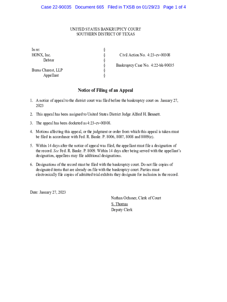 Case 2290035 Document 665 Filed in TSB on 01/29/23-Page 1 of 4UNITED STATES BANKRUPTCY COURT SOUTHERN DISTRICT OF Texas re: HOAX, Inc. Debtor Burns Chart, LLP Appellant Civil Action No. 4:23cv00308