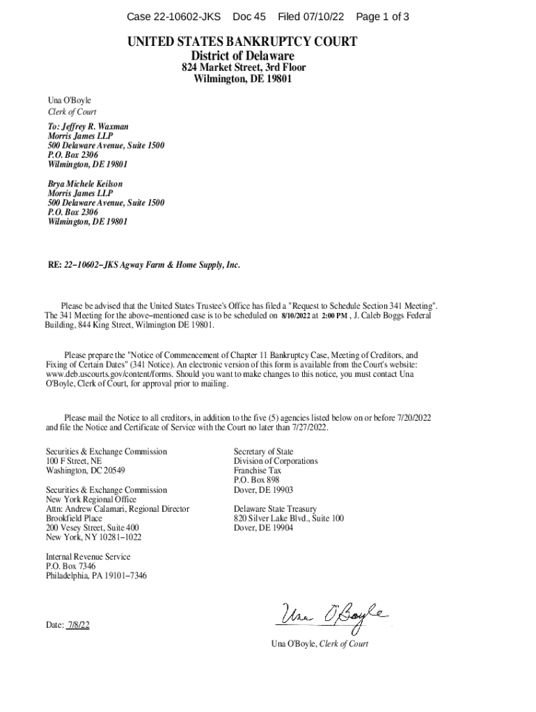 Case 2210602JKSDoc 45Filed 07/10/22Page 1 of 3UNITED STATES BANKRUPTCY COURT District of Delaware 824 Market Street, 3rd Floor Wilmington, DE 19801 RNA O\'Boyle Clerk of Court To: Jeffrey R. Waxman