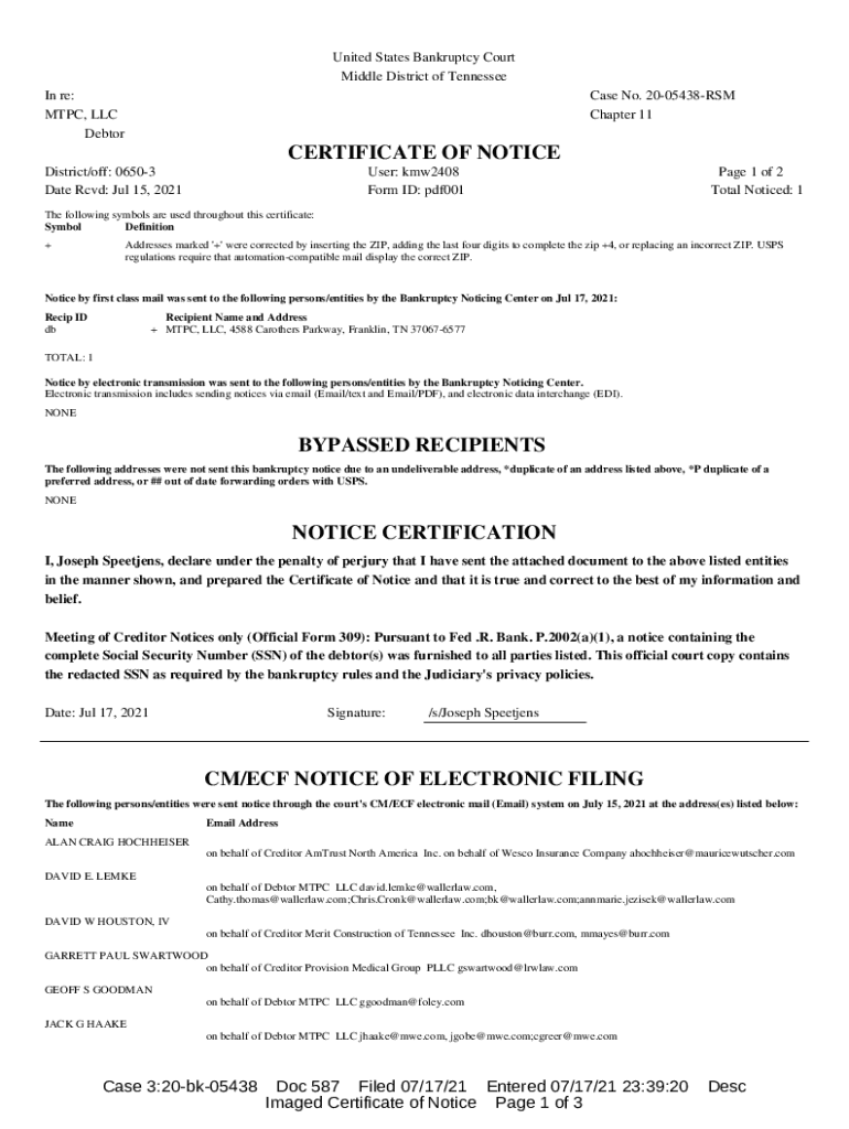 United States Bankruptcy Court Middle District of Tennessee In re: MTC, LLC Debtor Case No. 2005438RSM Chapter 11CERTIFICATE OF NOTICE District/off: 06503 Date RCD: Jul 15, 2021User: kmw2408 Form