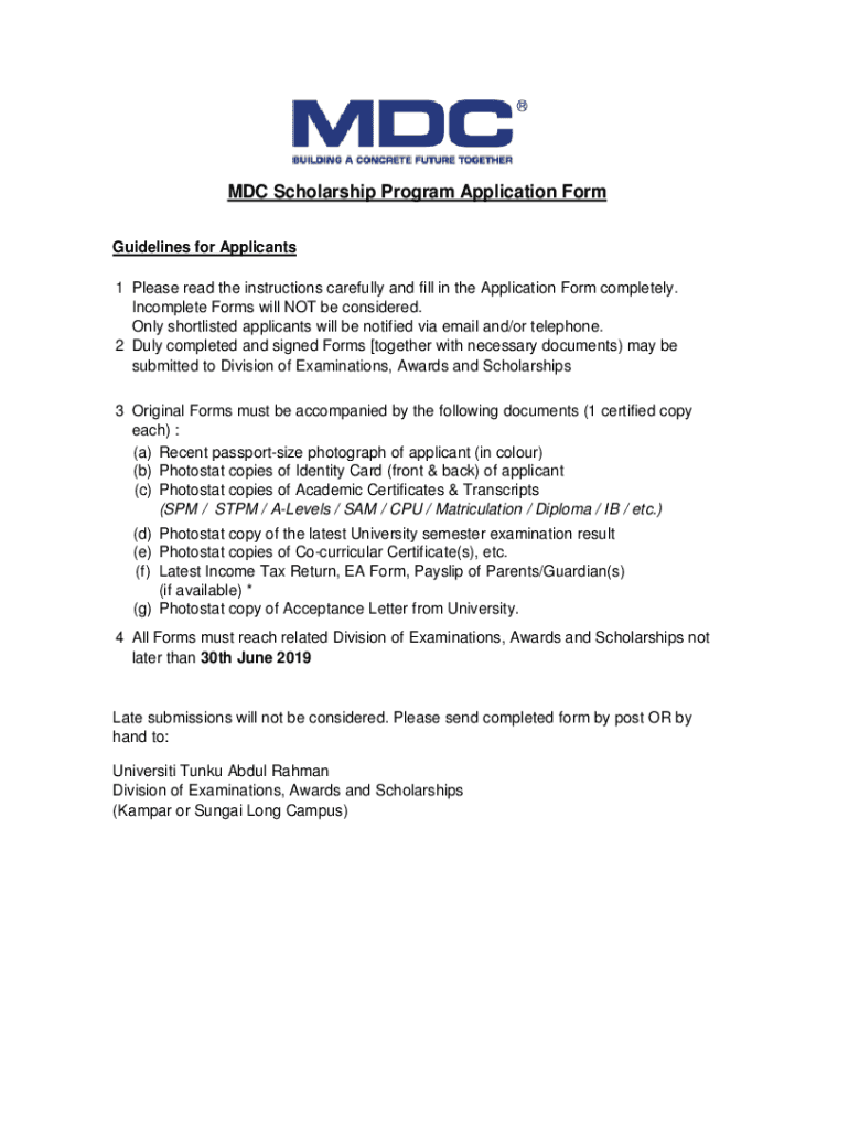 MDC Scholarship Program Application Form Guidelines for Applicants 1 Please read the instructions carefully and fill in the Application Form completely. Incomplete Forms will NOT be considered. Only