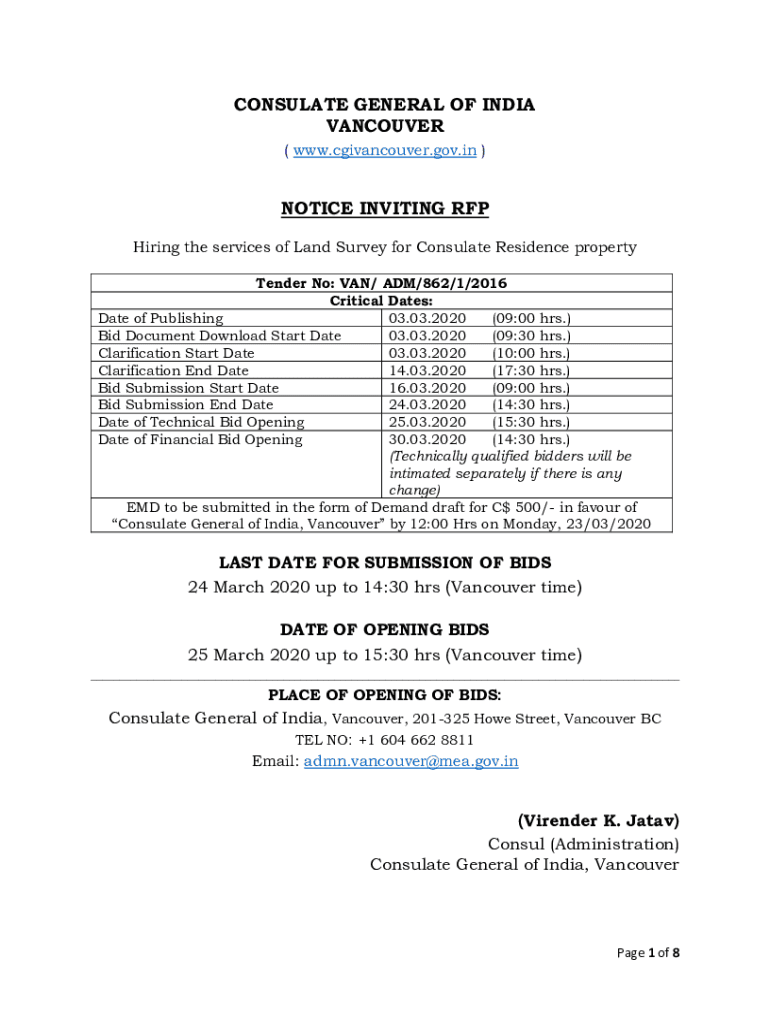 CONSULATE GENERAL OF INDIA VANCOUVER (www.cgivancouver.gov.in)NOTICE INVITING RFP Hiring the services of Land Survey for Consulate Residence property Tender No: VAN/ ADM/862/1/2016 Critical Dates: