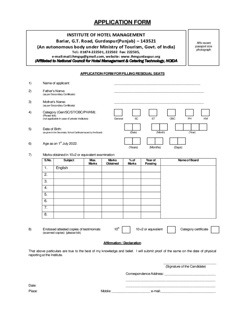 APPLICATION FORM INSTITUTE OF HOTEL MANAGEMENT Burial, G.T. Road, Durgapur(Punjab) 143521 (An autonomous body under Ministry of Tourism, Govt. of India)Affix recent passport size photographer.: 01874222501,