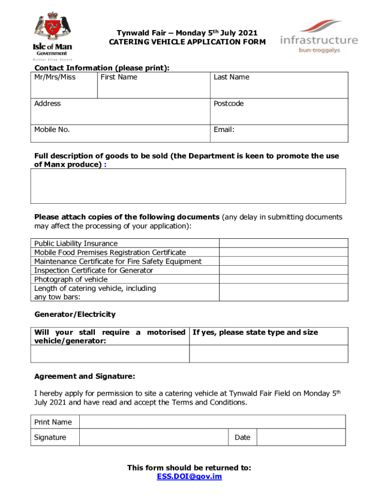 Tyndall Fair Monday 5th July 2021 CATERING VEHICLE APPLICATION FORM Contact Information (please print): Mr/Mrs/Miss First Nameless NameAddressPostcodeMobile No. Email:Full description of goods to