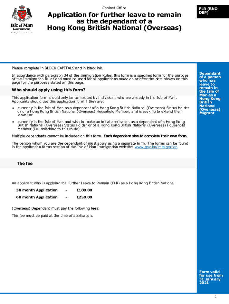 Cabinet OfficeApplication for further leave to remain as the dependent of a Hong Kong British National (Overseas)FLR (BNO DEP)Please complete in BLOCK CAPITALS and in black ink. In accordance with