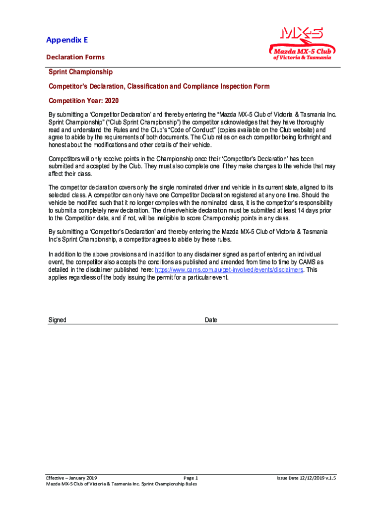 Appendix E Declaration Forms Sprint Championship Competitors Declaration, Classification and Compliance Inspection Form Competition Year: 2020 By submitting a Competitor Declaration and thereby entering