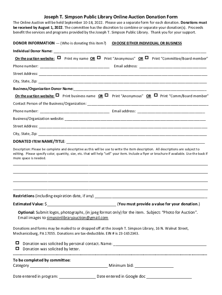 Joseph T. Simpson Public Library Online Auction Donation Forth Online Auction will be held September 1018, 2022. Please use a separate form for each donation. Donations must be received by August