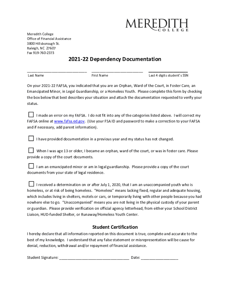 Meredith College Office of Financial Assistance 3800 Hillsborough St. Raleigh, NC 27607 Fax 9197602373202122 Dependency Documentation _________Last NameFirst Nameless 4 digits students Non your 202122