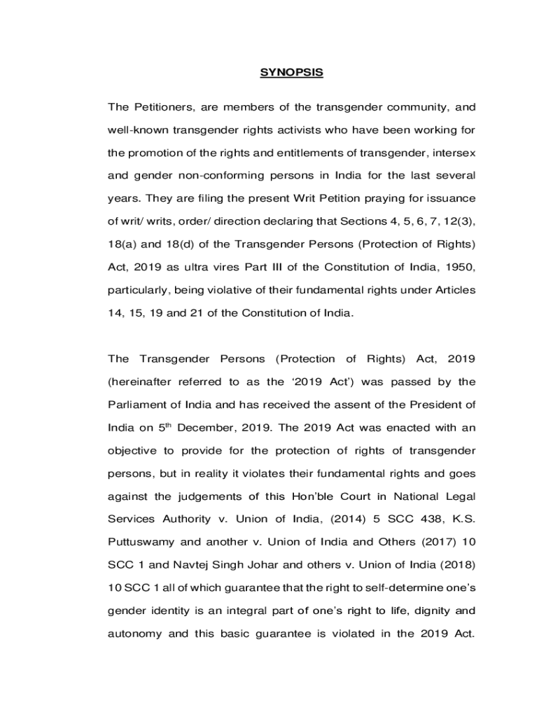 Synopsis Petitioners, are members of the transgender community, and well-known transgender rights activists who have been working for the promotion of the rights and entitlements of transgender, intersex