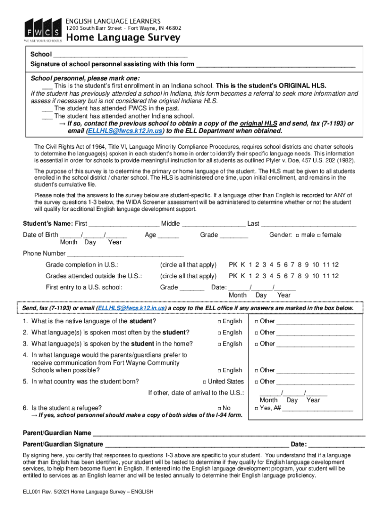 ENGLISH LANGUAGE LEARNERS1200 South Barr Street Fort Wayne, IN 46802Home Language Survey School ___ Signature of school personnel assisting with this form ___ School personnel, please mark one: ___