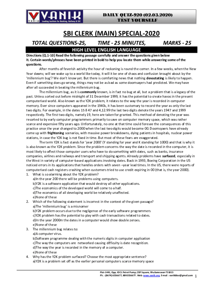 DAILY QUIZ920 (02.03.2020) TEST YOURSELF SBI CLERK (MAIN) SPECIAL2020 TOTAL QUESTIONS25,TIME 25 MINUTES, MARKS 25HIGH LEVEL ENGLISH LANGUAGE Directions (Q.110) Read the following passage carefully