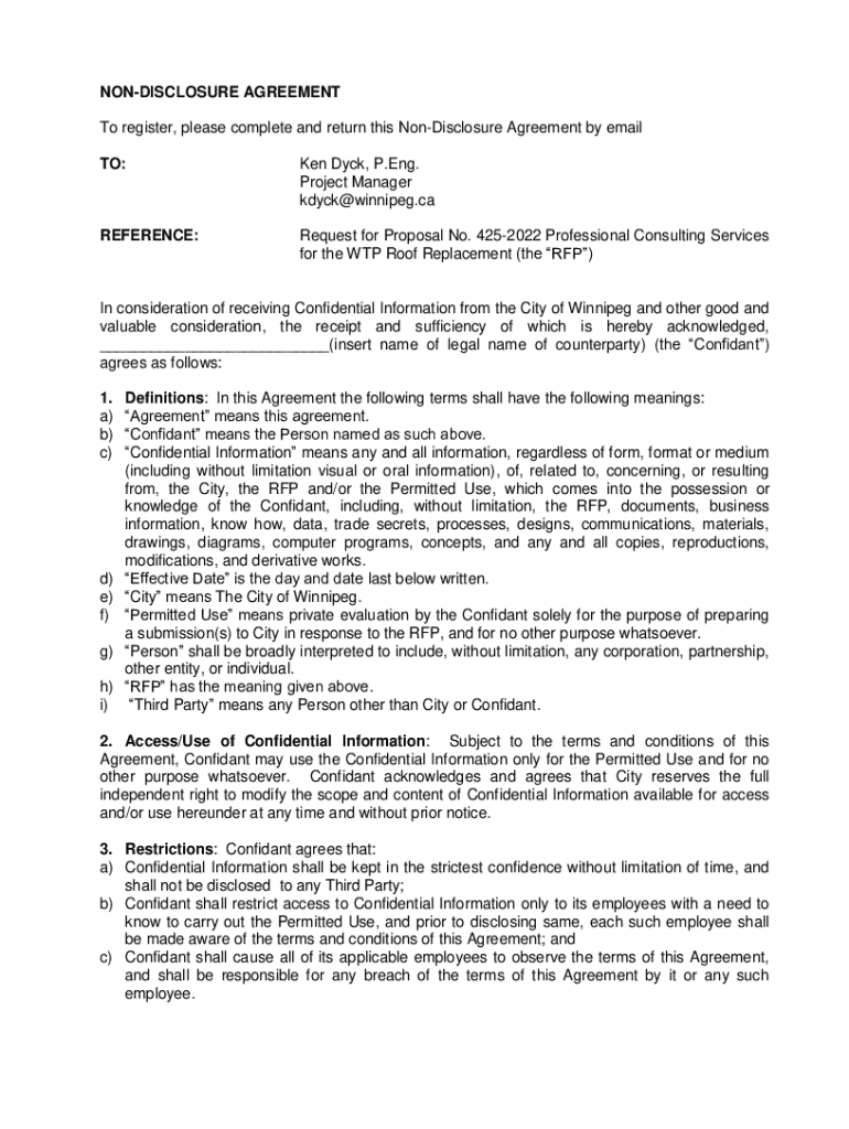 NONDISCLOSURE AGREEMENT To register, please complete and return this Nondisclosure Agreement by email TO:Ken Deck, P. Eng. Project Manager kdyck@winnipeg.caREFERENCE:Request for Proposal No. 4252022