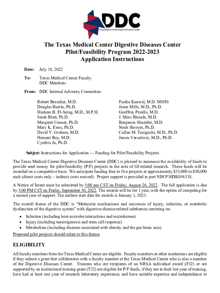 The Texas Medical Center Digestive Diseases Center Pilot/Feasibility Program 20222023 Application Instructions Date:July 18, 2022To:Texas Medical Center Faculty DDC MembersFrom: DDC Internal Advisory