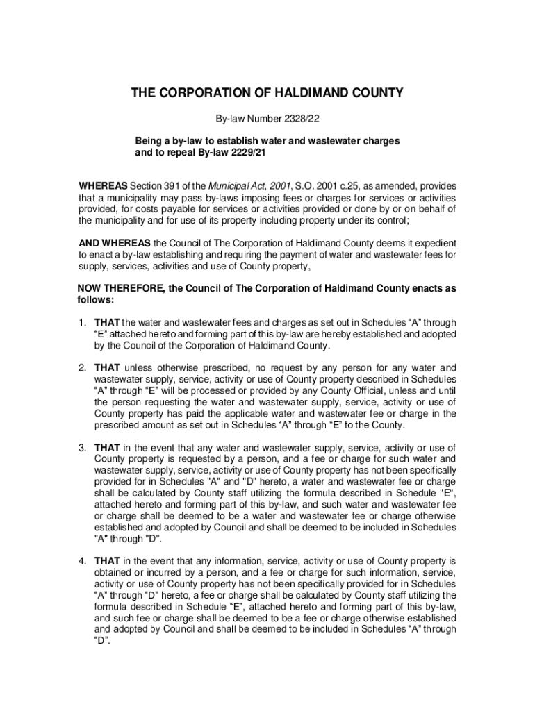 THE CORPORATION OF HALDIMAND COUNTY Bylaw Number 2328/22 Being a bylaw to establish water and wastewater charges and to repeal Bylaw 2229/21WHEREAS Section 391 of the Municipal Act, 2001, S.O. 2001