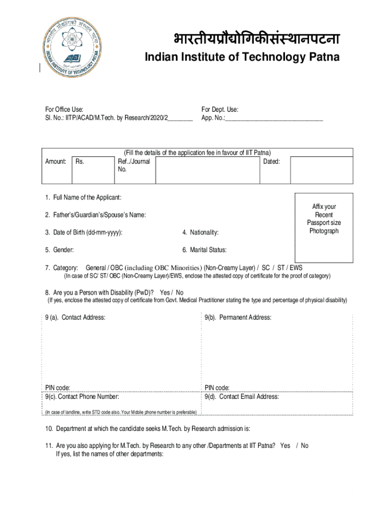 Indian Institute of Technology Patna Office Use: SL. No.: IIT/ACID/M. Tech. By Research/2020/2___Amount:For Dept. Use: App. No.:___(Fill the details with the application fee in favor of IIT Patna)
