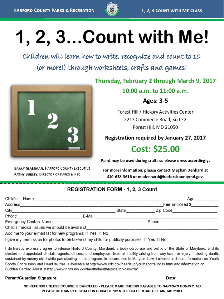 Harford County Parks & Recreation1, 2, 3 Count with Me Class1, 2, 3... Count with Me! Children will learn how to write, recognize and count to 10 (or more!) through worksheets, crafts and games!1Thursday,