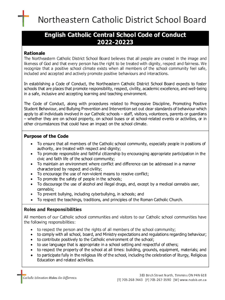 Northeastern Catholic District School Board English Catholic Central School Code of Conduct 202220223 Rationale Northeastern Catholic District School Board believes that all people are created in