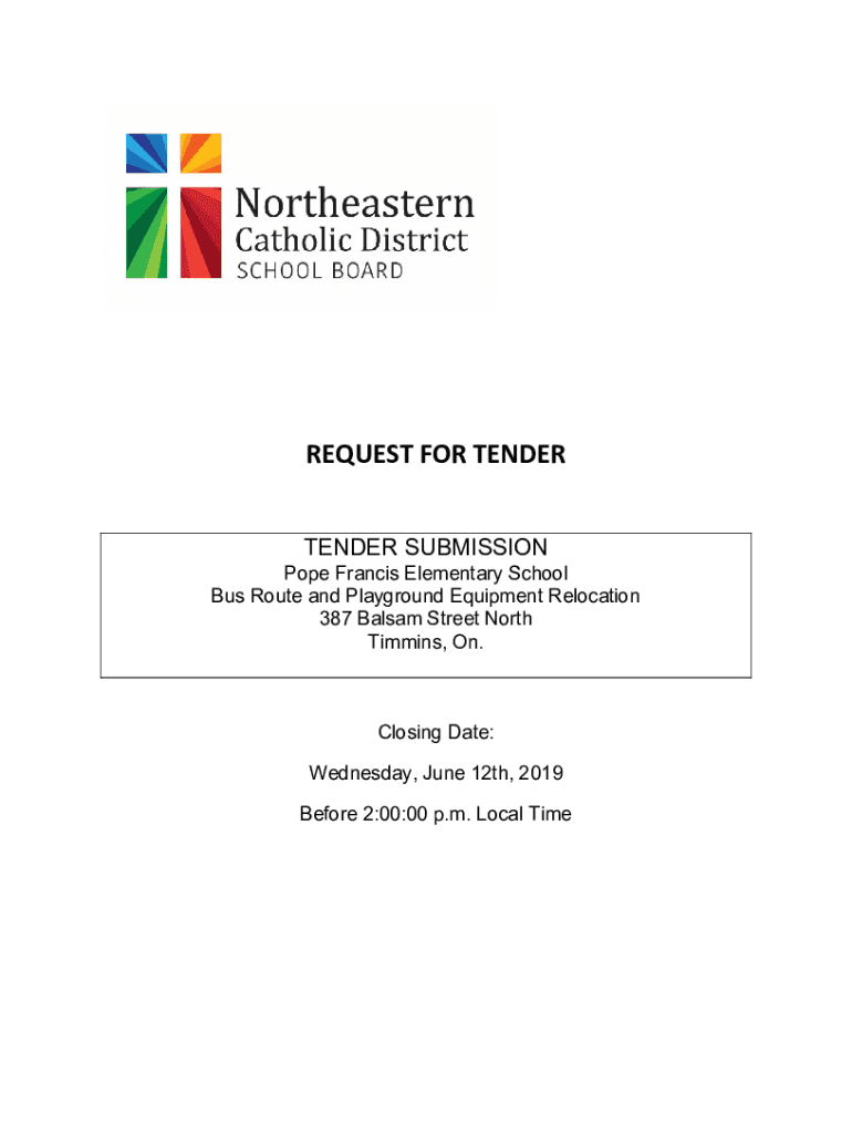 REQUESTFORTENDER TENDER SUBMISSION Pope Francis Elementary School Bus Route and Playground Equipment Relocation 387 Balsam Street North Timmons, On. Closing Date: Wednesday, June 12th, 2019 Before