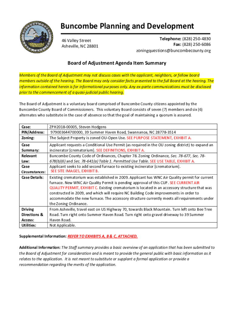 Duncombe Planning and Development 46 Valley Street Asheville, NC 28801Telephone: (828) 2504830 Fax: (828) 2506086 zoningquestions@buncombecounty.orgBoard of Adjustment Agenda Item Summary Members