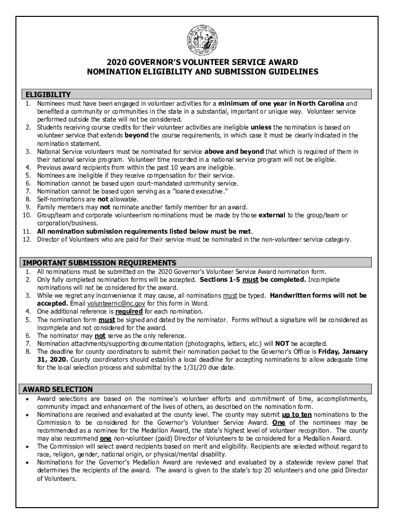 2020 GOVERNORS VOLUNTEER SERVICE AWARD NOMINATION ELIGIBILITY AND SUBMISSION GUIDELINES ELIGIBILITY1. Nominees must have been engaged in volunteer activities for a minimum of one year in North Carolina