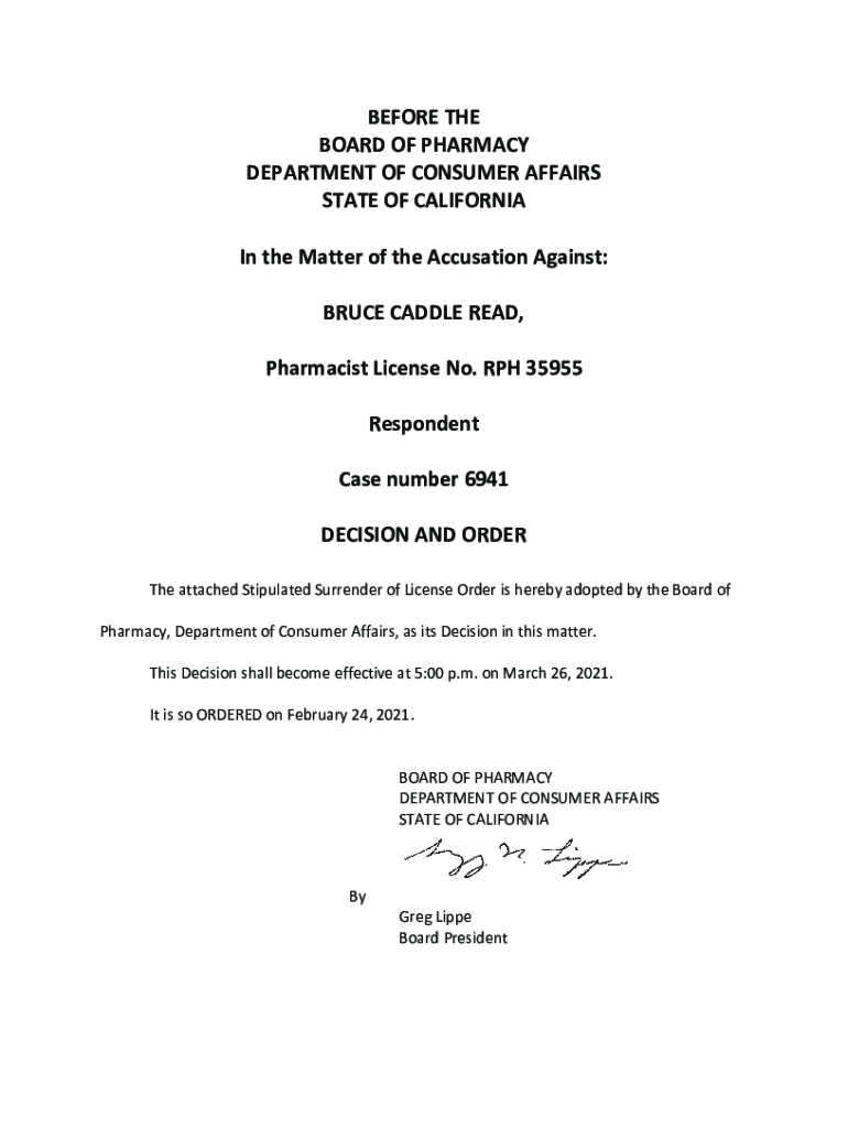 BEFORE THE BOARD OF PHARMACY DEPARTMENT OF CONSUMER AFFAIRS STATE OF CALIFORNIA In the Matter of the Accusation Against: BRUCE SADDLE READ, Pharmacist License No. MPH 35955 Respondent Case number