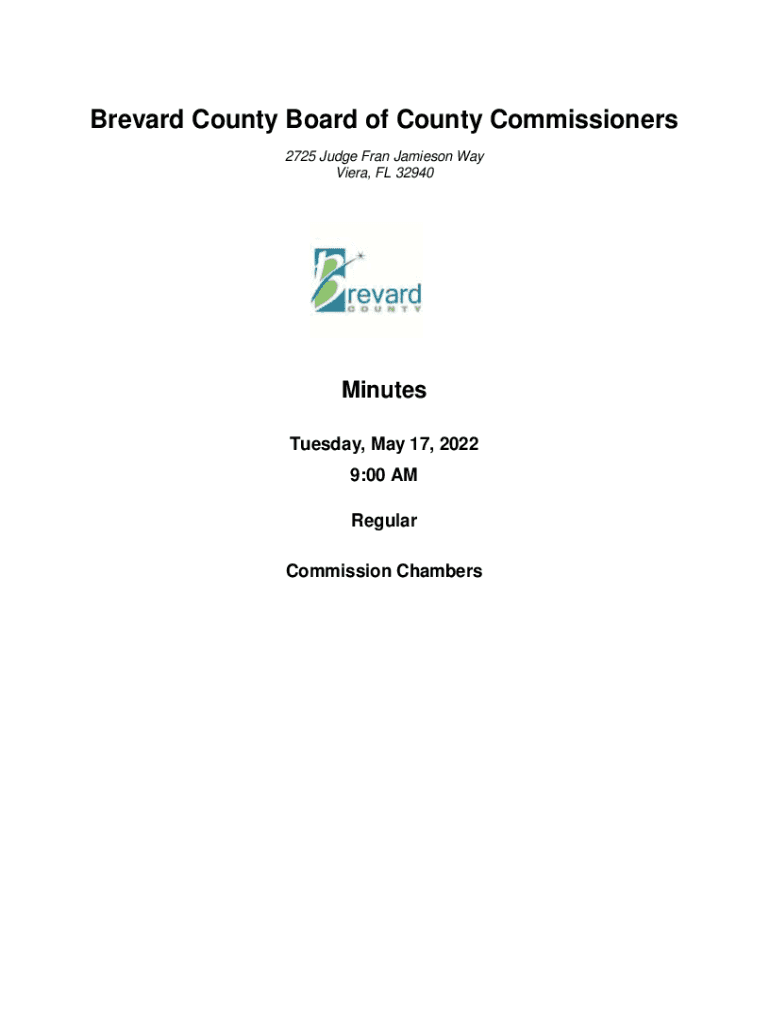 Brevard County Board of County Commissioners 2725 Judge Fran Jamieson Way Vera, FL 32940Minutes Tuesday, May 17, 2022 9:00 AM Regular Commission Chambers. CALL TO ORDER 9:03 AM Present: Absent:C.