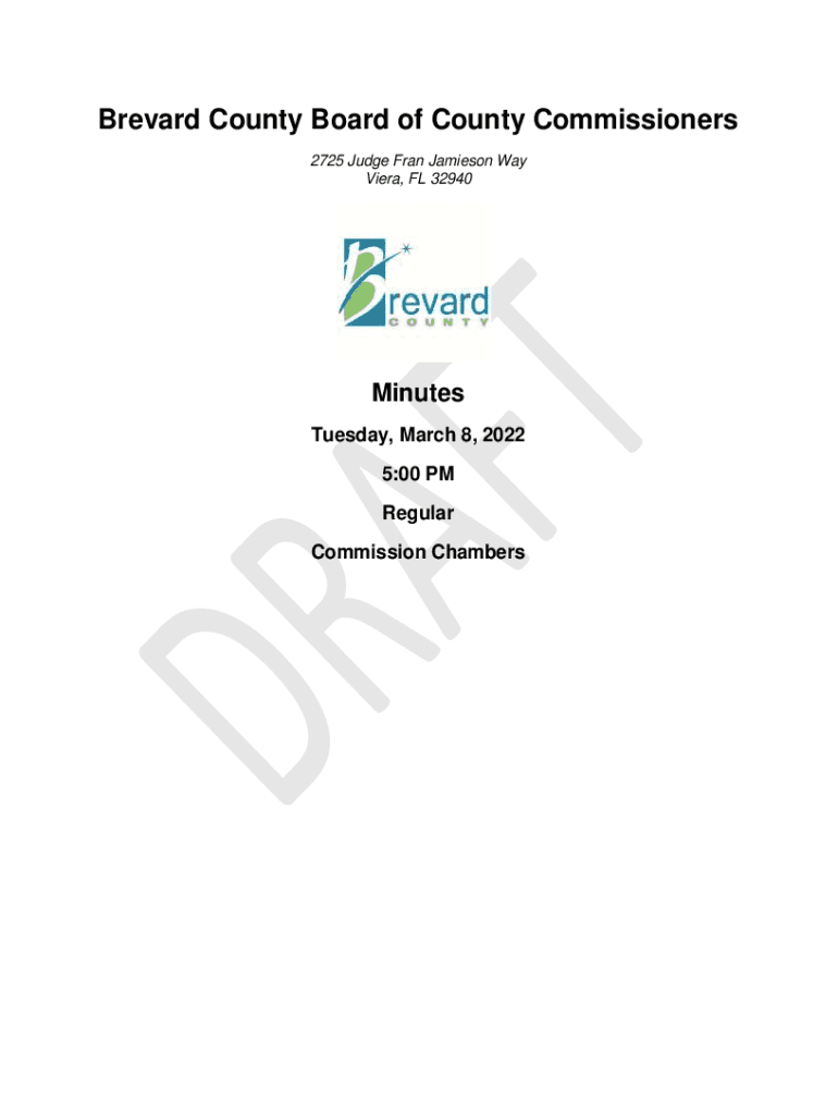 Brevard County Board of County Commissioners 2725 Judge Fran Jamieson Way Vera, FL 32940Minutes Tuesday, March 8, 2022 5:00 PM Regular Commission Chambers. CALL TO ORDER 5:04 PM Present:C. Commissioner