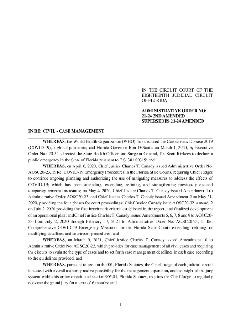 IN THE CIRCUIT COURT OF THE EIGHTEENTH JUDICIAL CIRCUIT OF FLORIDA ADMINISTRATIVE ORDER NO: 2124 2ND AMENDED SUPERSEDES 2124 AMENDED IN RE: CIVIL CASE MANAGEMENT ___ WHEREAS, the World Health Organization