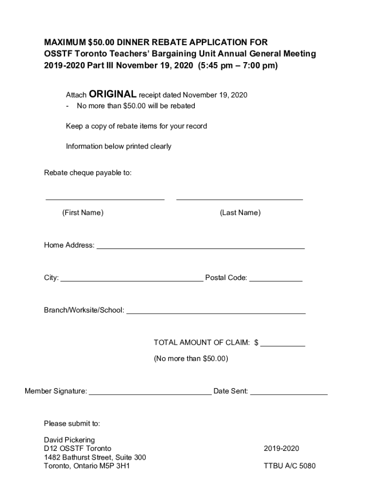 MAXIMUM $50.00 DINNER REBATE APPLICATION FOR OS STF Toronto Teachers Bargaining Unit Annual General Meeting 20192020 Part III November 19, 2020 (5:45 pm 7:00 pm) Attach ORIGINAL receipt dated November