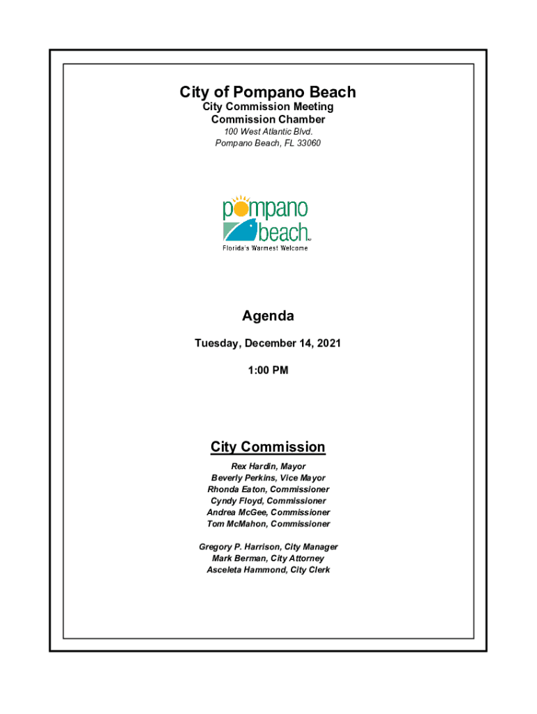 City of Pompano Beach City Commission Meeting Commission Chamber 100 West Atlantic Blvd. Pompano Beach, FL 33060Agenda Tuesday, December 14, 2021 1:00 City Commission Rex Hardin, Mayor Beverly Perkins,