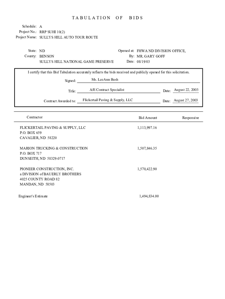 TABULATIONOFBIDSSchedule: A Project No.: RAP SUFI 10(2) Project Name: SULLY HILL AUTO TOUR ROUTE State: ND County: BENSON SULLY HILL NATIONAL GAME PRESERVEOpened at: FHA ND DIVISION OFFICE, By: MR.