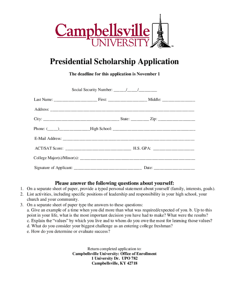 Presidential Scholarship Application The deadline for this application is November 1Social Security Number: ___/___/___ Last Name: ___ First: ___ Middle: ___ Address: ___ City: ___ State: ___ Zip: