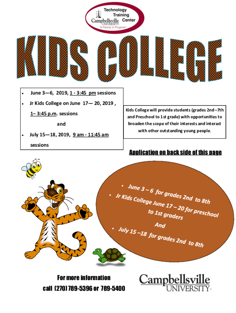 June 36, 2019, 1 3:45 pm sessions Jr Kids College on June 17 20, 2019, 1 3:45 p.m. sessions and July 1518, 2019, 9 am 11:45 AIDS College will provide students (grades 2nd 7th and Preschool to 1st