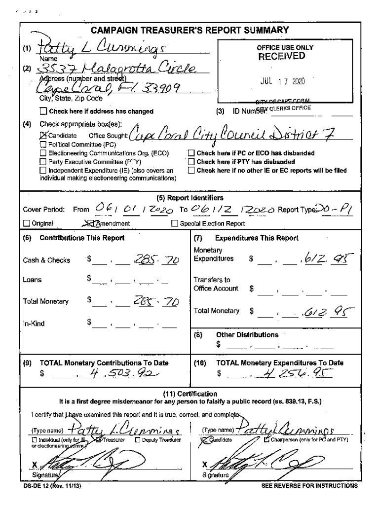 ?:CAMPAIGN TREASURER\'S REPORT SUMMARY1Mb.;. L(1’S\'OFFICEUSEONLYRECEIVEDName/Daley_ROTC!?, ., C!tie. N::\”\'! Jobber and sir. Co/l:L() t. j3 90 9 s3S3 7!2l City, State, Zip Code Jul 1 7 2020D