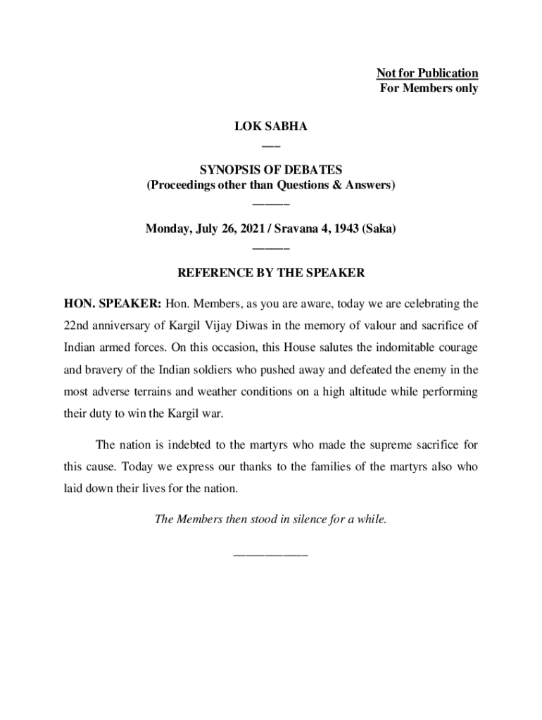 Not for Publication For Members only OK SASHA ___ SYNOPSIS OF DEBATES (Proceedings other than Questions & Answers) ___ Monday, July 26, 2021 / Havana 4, 1943 (Aka) ___ REFERENCE BY THE SPEAKER HON.