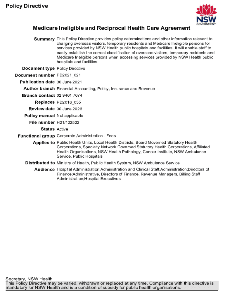 Policy Directive Medicare Ineligible and Reciprocal Health Care Agreement Summary This Policy Directive provides policy determinations and other information relevant to charging overseas visitors,