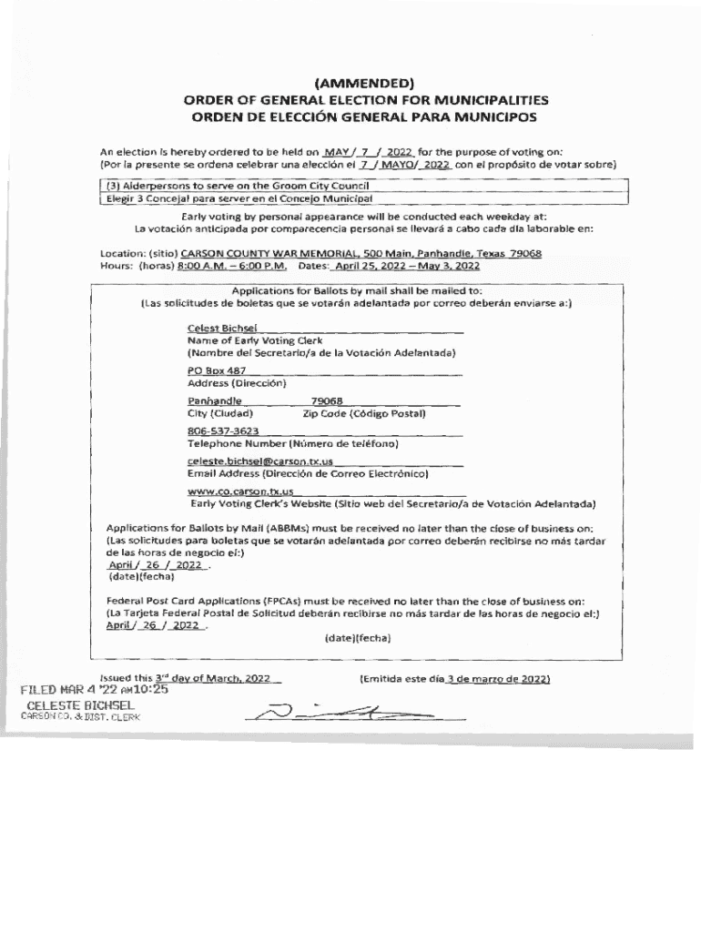 (AMENDED) ORDER OF GENERAL ELECTION FOR MUNICIPALITIES ORDER DE ELECCl6N GENERAL PARA MUNICIPAL An election is hereby ordered to be held on MAY /_L_/ 2022 for the purpose of voting on: (POR la present